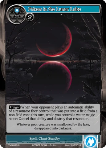 | Abilities: | [Trigger] When your opponent plays an automatic ability of a reasonator they control that was put into a field from a non-field zone this turn, while you control a water magic stone: Cancel that ability and destroy that resonator. | |