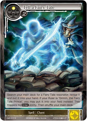 | Abilities: | Search your main deck for a Fairy Tale resonator, reveal it and put it into your hand. If your Ruler is "Grimm, the Fairy Tale Prince", you may put it into your field instead. This triggers its [Enter] ability. Then shuffle your main deck. | |